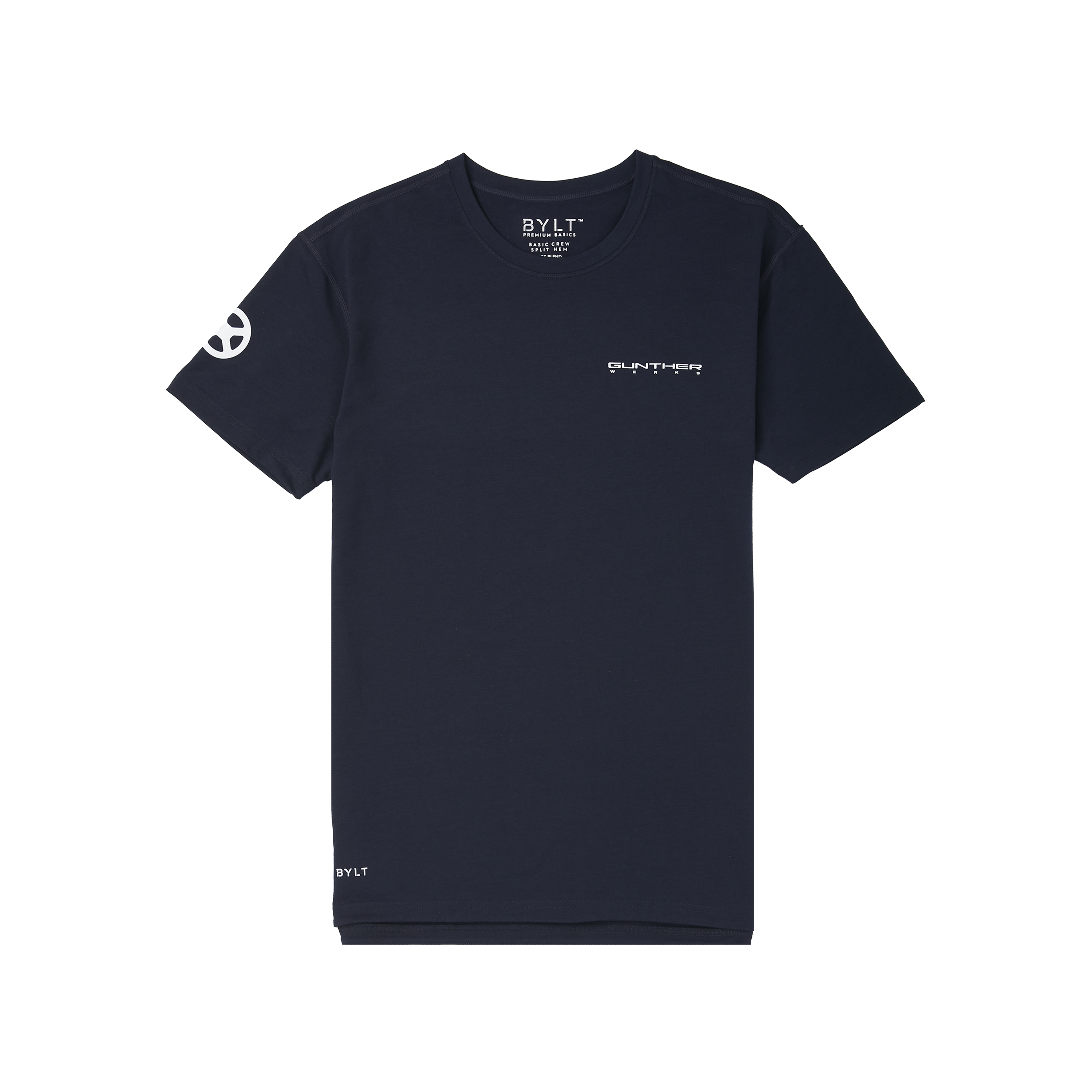 Navy blue GW x BYLT crew cut. Legacy logo on breast and circle ‘x’ on right sleeve